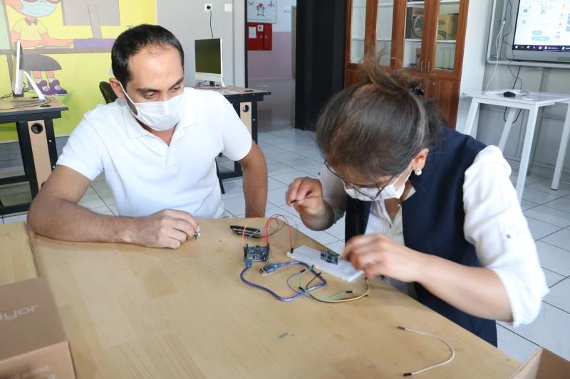 Aslan, daha sonra şube müdürleriyle birlikte Milli Eğitim Müdürlüğünce temin edilen Arduino setlerini öğretmenlere takdim etti.