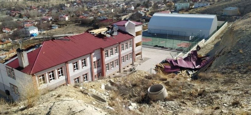 Sivas’ın Gürün ilçesinde etkili olan şiddetli rüzgar okulun çatısını uçurdu, çatının uçtuğu okul bahçesinde öğrencilerin olmayışı olası bir faciayı önledi.