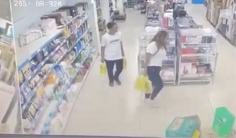 Hırsızlık yapmadan önce markette müşteri gibi davranan şüphelilerden birisinin raftaki ürünlerden bazılarını alıp tişörtünün içine sakladığı anlar güvenlik kameraları tarafından saniye saniye kaydedildi.