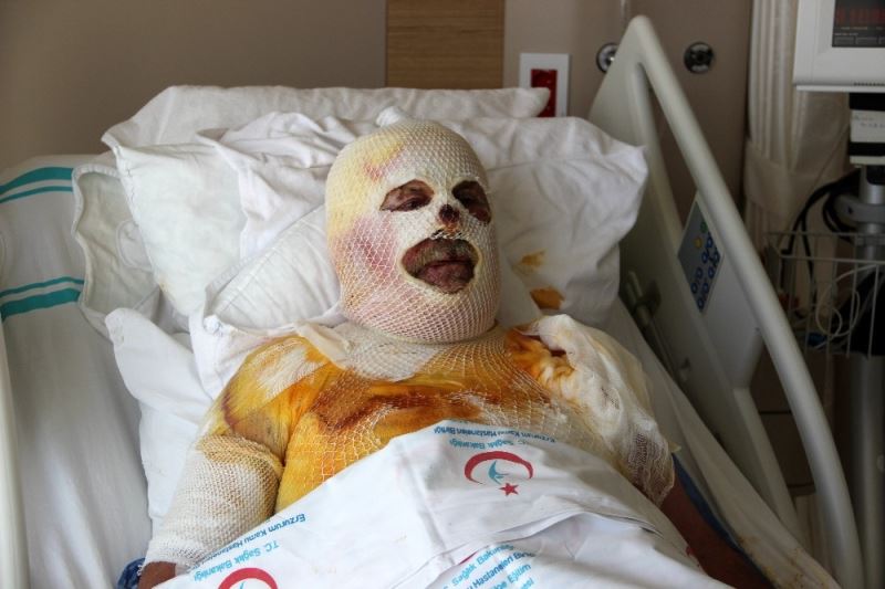 Alevler parlayınca ilk olarak göğsünün tutuştuğunu ifade eden Kadim Ercan, “Çıldır’ın Kayabeyi köyüne tatile gittik. Soba çayı yapalım dedik. Sabah erken saatte sobanın yanında duran benzini ağaç parçasının üstüne dökerek sobanın içinde ateşledim. Kalan benzinde plastik şişede masanın üstündeydi. Soba alevlenince şişeye de alevlendi. Üstüme sıçradı, üstüm tutuştu. Şişeyi attım atmasam ev de yanacaktı. Bağırdım, eşim içerideydi geldi. Köy muhtarı karşıdan görmüş geldi, söndürdüler. İlk göğsüm tutuştu, pijamalar vardı üzerimde. Karşı evden köy muhtarı bağırmamı duymuş geldi tişörtünü çıkartarak alevlere vurdu. Hanım kovalarla su döktü, söndürdüler. İlk Ardahan Devlet Hastanesine gittik sonra buraya sevk ettiler” diye konuştu.