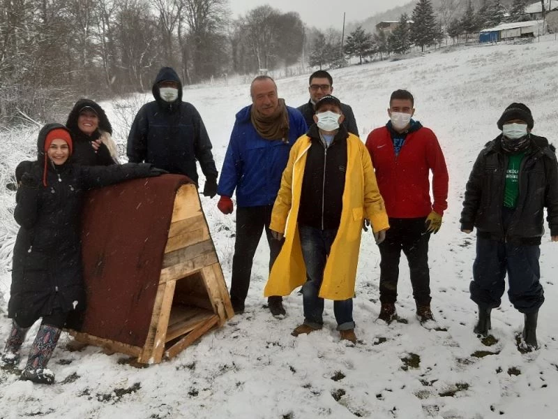 Soğuk havaya aldırış etmeden hayvanlara kulübe bıraktılar