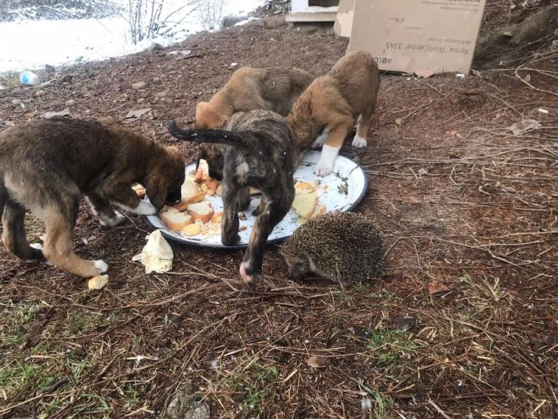 Karabük’ün Safranbolu ilçesinde Kerem Demir isimli vatandaş etkili olan kar yağışından dolayı yiyecek bulmakta zorlanan yavru köpekleri ve kirpiyi besledi.