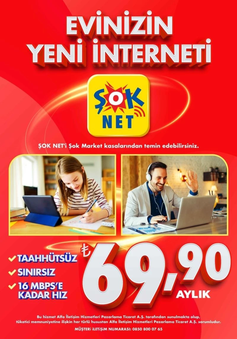 Kaliteli ürünleri uygun fiyatlarla sunarak ülke ve hane ekonomisine katkı sağlayan ŞOK Marketler, müşterilerinin ihtiyaçlarına yönelik yenilikçi bir hizmet sunuyor. Türkiye’nin 81 ilindeki mağazalarında satılmaya başlayan internet hizmeti ŞOK NET ile ‘evde internet’ artık taahhütsüz, limitsiz ve en uygun fiyatlarla sunuluyor.