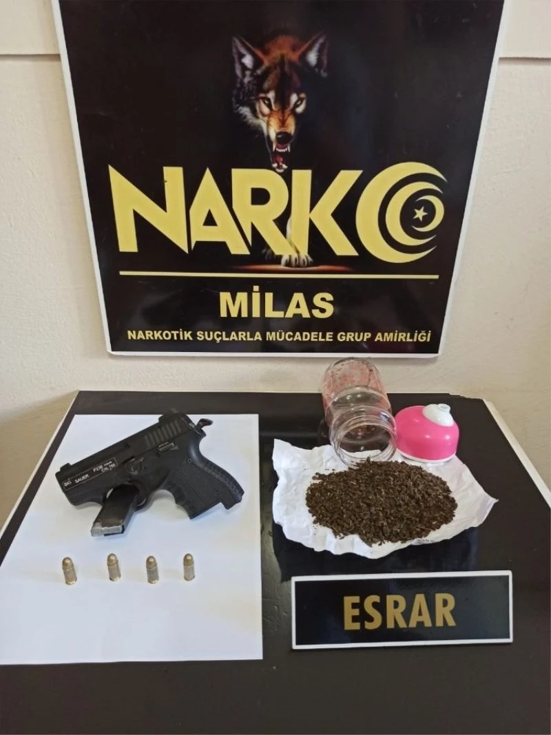 Milas Narkotik Suçlarla Mücadele Grup Amirliği ekiplerince gerçekleştirilen şok uygulamada esrar ve ruhsatsız tabanca ele geçirildi.