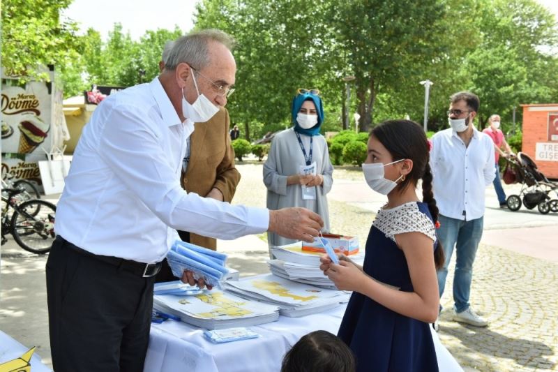 Uzun bir aradan sonra hem açık havada parklara çıkmış olmanın hem de hediye almanın mutluluğu yaşayan çocuklara maske de dağıtıldı.
