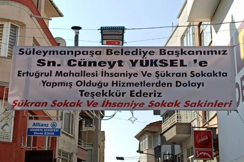 Öte yandan, çalışmaların tamamlanmasının ardından sokak sakinleri ve esnaf sokağın yenilenmesinden ötürü duydukları memnuniyeti sokağa astıkları pankartla dile getirdiler. Pankartta, “Süleymanpaşa Belediye Başkanımız Sn. Cüneyt Yüksel’e Ertuğrul Mahallesi İhsaniye ve Şükran Sokak’ta yapmış olduğu hizmetlerden dolayı teşekkür ederiz” ifadeleri yer aldı.