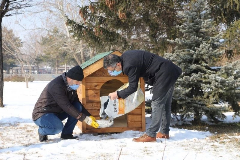 Bu kapsamda Atatürk parkında kulübelerin montaj işlemleri yapılırken Erzincan Belediye Başkanı Bekir Aksun ve eşi Ürküş Aksun’da çalışma alanına gelerek sokak hayvanları için mama bıraktılar.