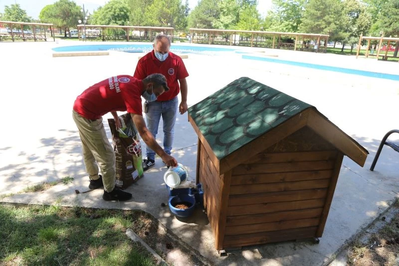Şehrin 35 farklı noktasında bulunan kulübelere ekipler sokak hayvanları için yem ve su bıraktı.