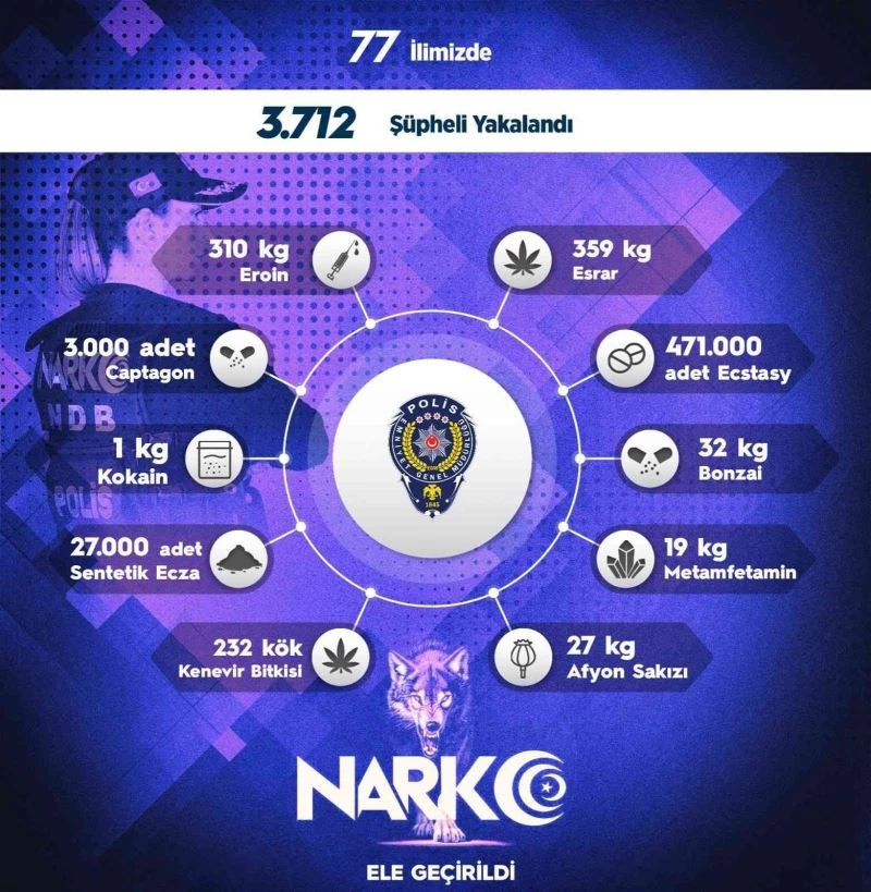 Emniyet Genel Müdürlüğü, uyuşturucu ticaretini önlemeye yönelik 77 ilde düzenlediği ’Sokak’ operasyonlarında bir hafta içerisinde şüpheli görülen 3 bin 712 kişiye adli işlem uygulandığını açıkladı. Operasyonlarda toplam; 310 kilogram eroin, 359 kilogram esrar, 471 bin adet extacy, 32 kilogram bonzai, 19 kilogram metamfetamin, 27 kilogram afyon sakızı, 232 kök kenevir bitkisi, 27 bin adet sentetik ecza, bir kilogram kokain, 3 bin captagon ele geçirildi.