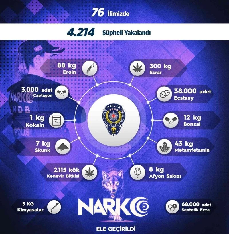 Emniyet Genel Müdürlüğü, uyuşturucu ticaretini önlemeye yönelik 76 ilde düzenlediği sokak operasyonlarında bir hafta içerisinde şüpheli görülen 4 bin 214 kişiye adli işlem uygulandığını açıkladı. Operasyonlarda toplam 88 kilogram eroin, 3 bin adet captagon, 1 kilogram kokain, 7 kilogram skunk, 2 bin 115 kök kenevir bitkisi, 3 kilogram kimyasallar, 300 kilogram esrar, 38 bin adet ecstasy, 12 kilogram bonzai, 43 kilogram metamfetamin, 8 kilogram afyon sakızı, 68 bin adet sentetik ecza maddesi ele geçirildi.