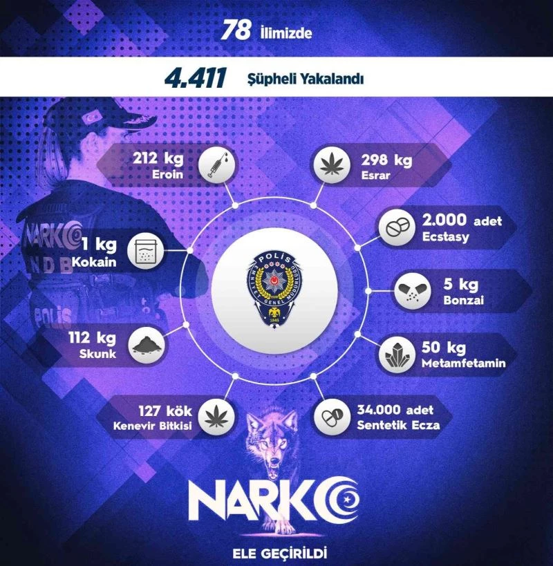 Emniyet Genel Müdürlüğü, uyuşturucu ticaretini önlemeye yönelik 78 ilde düzenlediği ’Sokak’ operasyonlarında bir hafta içerisinde şüpheli görülen 4 bin 411 kişiye adli işlem uygulandığını açıkladı. Operasyonlarda toplam; 212 kilogram eroin, 298 kilogram esrar, 2 bin adet extacy, 5 kilogram bonzai, 50 kilogram metamfetamin, 127 kök kenevir bitkisi, 34 bin adet sentetik ecza, 112 kilogram skunk, bir kilogram kokain ele geçirildi.