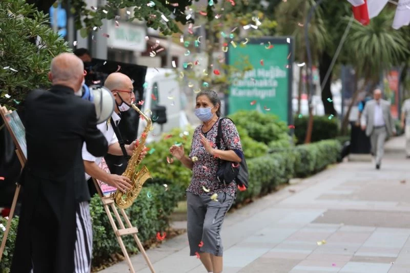 Kocaeli’nin İzmit ilçesinde en işlek alanlardan biri olan yürüyüş yolunda yapılan sosyal deney ile maskelerini doğru takan vatandaşlar, bando eşliğinde yola çıkan tiyatro oyuncuları tarafından çift kişilik tiyatro bileti ile ödüllendirildi.