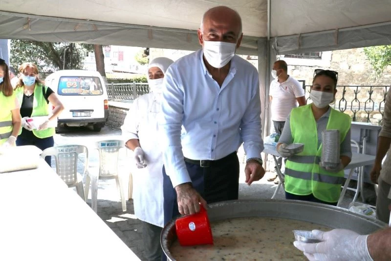 Söke Belediye Meydanı’nda düzenlenen hayır etkinliğinde Başkan Levent Tuncel, vatandaşlara aşure dağıttı.