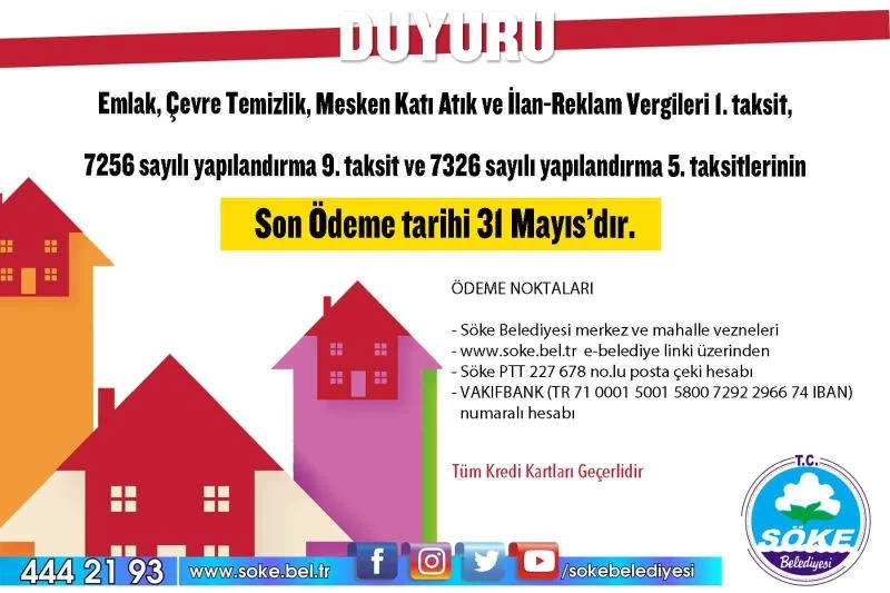 Yapılan ilanda; “7326 sayılı kanuna istinaden gerçekleştirilen yapılandırmaların 5. Taksit ödemeleri, 7256 sayılı kanuna istinaden gerçekleştirilen yapılandırmaların 9. Taksit ödemeleri ve 2022 yılı 1. Taksit ödemelerinin son tarihi 31 Mayıs 2022 Salı’dır. Emlak, Çevre Temizlik, Mesken Katı Atık ve İlan-Reklam vergi ödemeleri Söke Belediyesi’nin merkez ve mahalle veznelerinden yapılabileceği gibi www.soke.bel.tr internet adresi E-Belediye linki üzerinden, banka ve posta hesaplarına yapılabilmektedir” denildi.