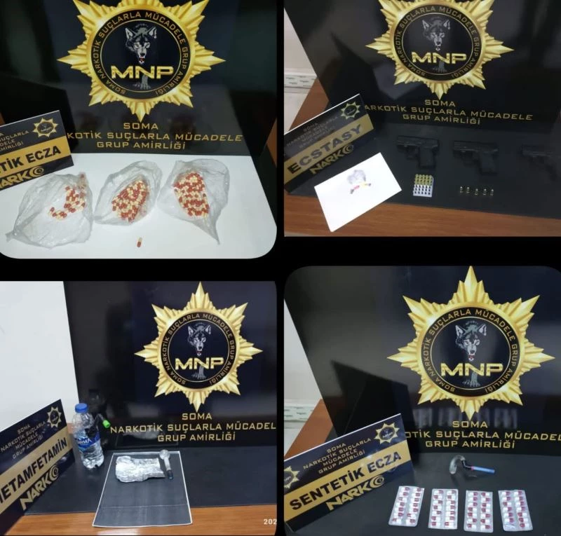Soma Narkotik Suçlarla Mücadele Grup Amirliği ekiplerinin uyuşturucu veya uyarıcı madde ticareti yapan, nakleden ve kullanan şahıslara yönelik yaptığı çalışmalarda son 10 gün içerisinde 30 gram metamfetamin, 950 adet sentetik hap, 4 adet ecstasy, çok sayıda uyuşturucu madde kullanmaya yarayan aparat, uyuşturucu madde ticaretinden elde edildiği değerlendirilen 5 bin 550 TL ve 3 adet ruhsatsız silah ele geçirildi. Yapılan operasyonlarda gözaltın alınan 5 şüpheli ise, uyuşturucu veya uyarıcı madde imal ve ticareti suçundan çıkarıldıkları mahkemece tutuklanarak cezaevine gönderildi.