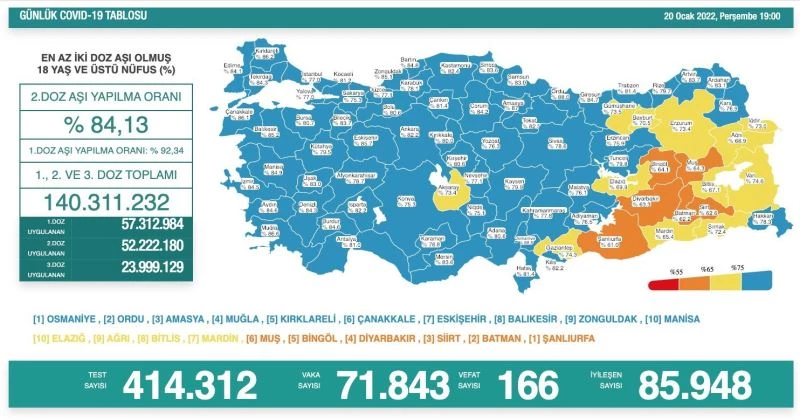 Sağlık Bakanlığı tarafından Türkiye’nin yeni korona virüs tablosu açıklandı. 20 Ocak’ta açıklanan 24 saatlik verilere göre 71 bin 843 vaka tespit edildi. Virüs nedeniyle hayatını kaybedenlerin sayısı 166 oldu. Bir günde toplam 418 bin 253 test yapılırken, iyileşen hasta sayısı 85 bin 948 olarak kaydedildi. Sağlık Bakanlığı tarafından açıklanan tabloda, 2 doz aşılama verilerine de yer verildi. En az 2 doz aşı olmuş 18 yaş üzeri nüfusu kapsayan verilere göre Türkiye’de 2. doz aşılama ortalaması yüzde 84,13 oldu. 1. doz ortalaması yüzde 92,34 olurken, 1., 2. ve 3. doz aşısını olan vatandaş sayısı toplamda 140 milyon 311 bin 232’e yükseldi.