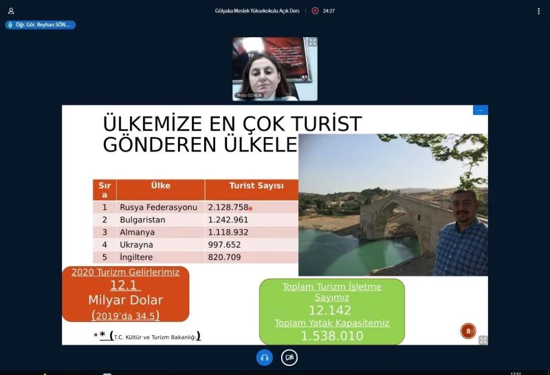 Düzce Üniversitesi Gölyaka Meslek Yüksekokulu tarafından düzenlenen ve kişisel gelişim için eşsiz fırsat sunan Açık Ders uygulamasında bu hafta, “Türkiye’de ve Dünyada Turizm Sektörüne Ait Veriler, Kültürel ve Doğal Miraslarımız Hakkında Bilgiler” konusu ele alındı.