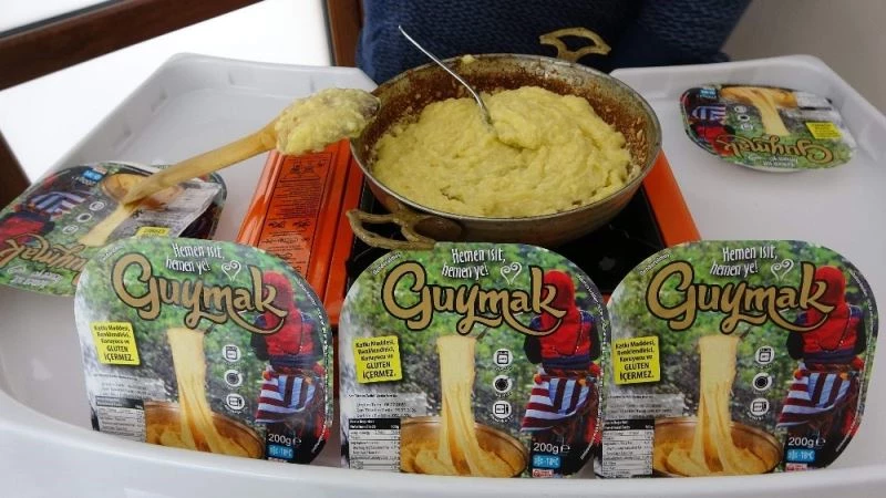 İçindeki malzemelerin büyük bir özenle hazırladığını ve 5 çeşit farklı peynir kullandıklarını kaydeden Onur, dünyada tek olduklarını belirterek “Sırrımız işimizi çok sevmemiz. İçinde 5 çeşit peynirimiz var. Her şey çok özenle seçildi. Suyundan, tereyağından, mısır ununa kadar her şey çok ince ayrıntılarıyla düşünüldü. Böyle bir ürünümüz oldu. Dünyada tekiz. İsveçliler’in City’s fan diye bir ürünü var ancak onlar bile dondurmayı başaramadılar. Biz şükürler olsun 5 yılın sonunda böyle bir ürün elde edebildik. Bizim markamız ‘Guymak’. İçinde glüten yok sağlık açısından besin değerleri çok yüksek. 65 yaş üstü olsun 18 yaş üstü olsun, hepsiyle ayrı anket yaptık bu anketin sonunda bu lezzeti yakaladık. Ürünümüze yağlı sevenler tereyağı ilave etmeleri gerekiyor başka hiçbir şey katmalarına gerek yok. Tavaya koyuyorlar kahvaltı sofrasını hazırlarken ürünümüz kendi kendine pişiyor” dedi.