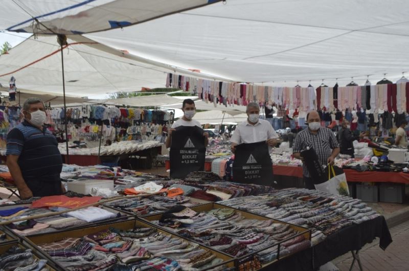 Polis ve Zabıta ekipleri pazara giren tüm vatandaşların ateşini ölçerken, 65 yaşın üzerindeki vatandaşlarla, gençlerin kimlikleri kontrol ediliyor. Kısıtlama kapsamında bulunanlar idari pazara cezasının ardından evlerine gönderiliyor. Bu arada meslek kuruluşları da sosyal mesafenin önemine vurgu yapmak adına üyelerine sloganlar içeren Küre Tekstil firmasının hazırlamış olduğu yelek ve dövizler dağıtıyor. Tuhafiyeciler Odası ile Sebzeciler Odası’nın yetkilileri tek tek tezgahları dolaşarak üyelerine bu kuralın önemini anlattı.