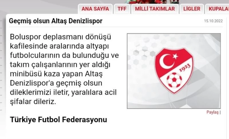 Denizlispor kafilesinin geçirdiği trafik kazasının ardından Türkiye Futbol Federasyonu ve spor kulüpleri geçmiş olsun mesajı yayımladı.