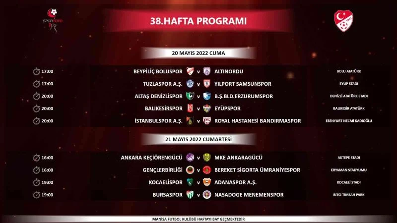 Spor Toto 1. Lig’in 2021-2022 sezonu 38. hafta programı açıklandı.