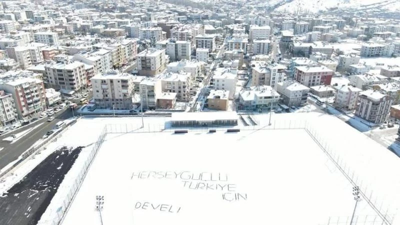 İlçede etkili olan kar yağışıyla birlikte güzel görüntüler oluştu. Develi İlçe Spor Müdürlüğü personeli, karla kaplı Develi İlçe Stadı’nın zeminine herşey güçlü Türkiye için yazdı. Yazıyı görenler fotoğraf çekinirken, stat ise dron ile havadan görüntülendi.