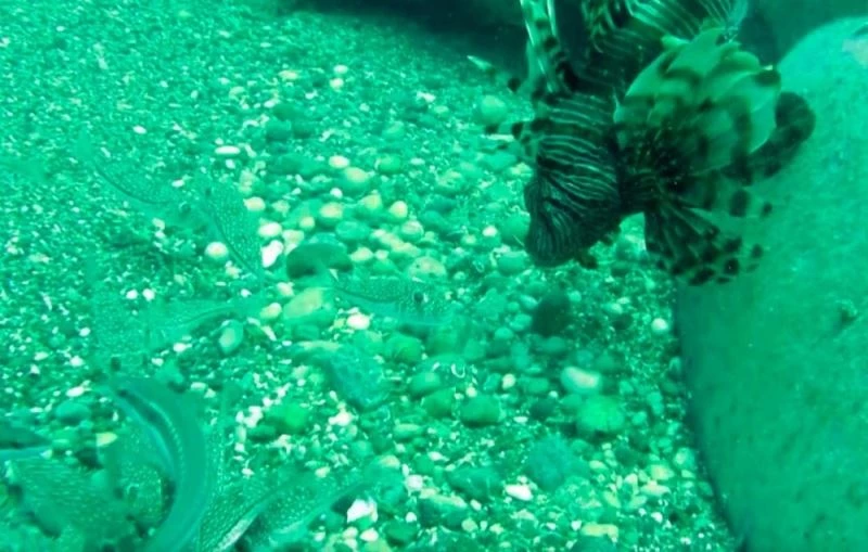 Borunun dipte kalması için konulan her beton parçasının yanında aslan balıklarını görüntülediklerini dile getiren Gökoğlu, “Korkmaya gerek yok. Onlarda insanları gördüğü zaman saklanıyorlar zaten. O saklandıkları bölgeye ayağınız girerse, yada bir çarpma olursa belki zarar verir. Durup dururken gelip aslan balığı insana zarar vermez.”dedi.