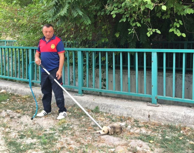 Aç ve susuz olduğu belirlenen köpeğe yiyecek ve su verilirken, yavru köpek ekipler tarafından köpek bakım ve rehabilitasyon merkezine teslim edildi.