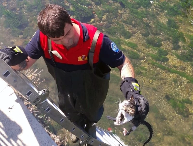 Fethiye Taşyaka Mahallesi 137 sokakta bulunan DSİ’ye ait su kanalında bir kedinin mahsur kaldığı bilgisinin ardından Büyükşehir Belediyesi Fethiye İtfaiye Grup Amirliği ekipleri su kanalına girerek mahsur kalan kediyi kurtardı.