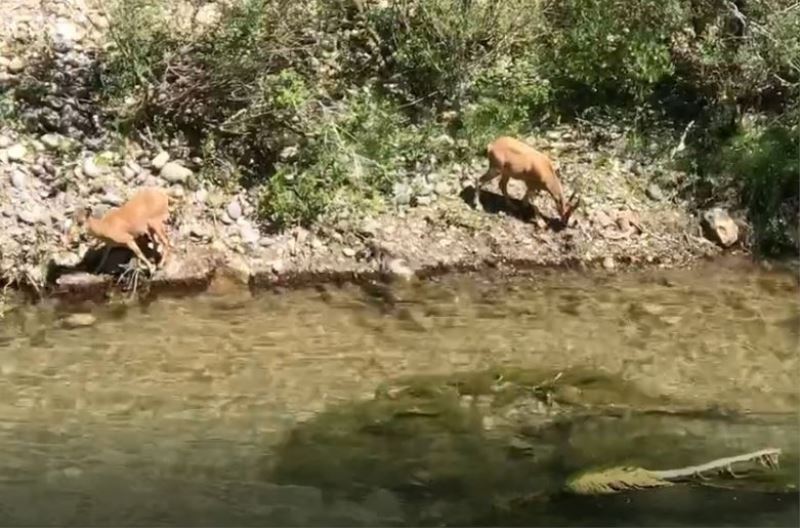 Yolda aracıyla seyir halindeyken dağ keçilerine denk geldiğini belirten Yılmazcan Şare, “Aracı sağa çekip cep telefonu kamerasıyla keçileri görüntüledim. Bir süre çay kenarında karınlarını doyuran ve su içen keçiler daha sonra yeniden ormanlık alana giderek gözden kayboldu” dedi.