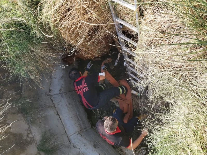 Su kuyusuna düşen dananın yardımına itfaiye ekipleri koştu