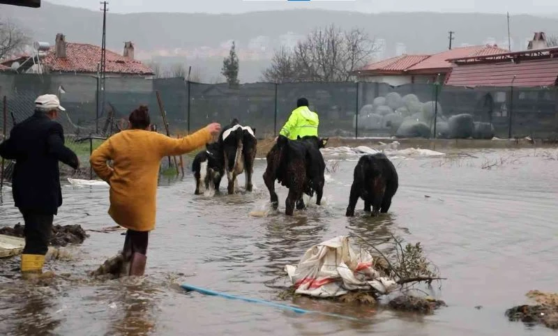Su taşkınında ahırda mahsur kalan havyanlar kurtarıldı