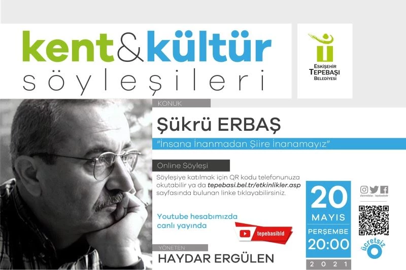 Tepebaşı Belediyesi’nin beğeniyle takip edilen Kent & Kültür Söyleşileri, birbirinden önemli isimleri Eskişehirlilerle bir araya getirmeyi sürdürüyor. Korona virüs tedbirleri kapsamında çevrim içi olarak gerçekleştirilen söyleşinin bu ayki konuğu sevilen şair Şükrü Erbaş olacak. Koordinatörlüğünü Haydar Ergülen’in yapacağı “İnsana İnanmadan Şiire İnanamayız” adlı söyleşi 20 Mayıs Perşembe günü saat 20.00’de gerçekleşecek.