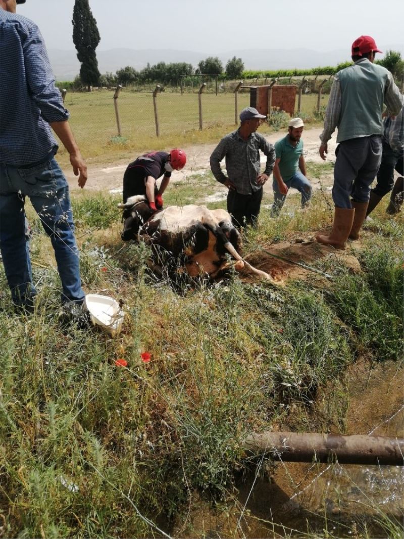 Vatandaşların can ve mal güvenliği için özveriyle çalışan Manisa Büyükşehir Belediyesi İtfaiye Dairesi Başkanlığı, bu kez Alaşehir’in Yeniköy Mahallesi’nde, sulama kanalında mahsur kalan inek için seferber oldu. Olay yerine gelen Manisa Büyükşehir Belediyesi İtfaiye Dairesi Başkanlığı, uzun uğraşlar sonrası ineği kanaldan çıkardı. Boğulmaktan kurtarılan inek, daha sonra sahibine teslim edildi.