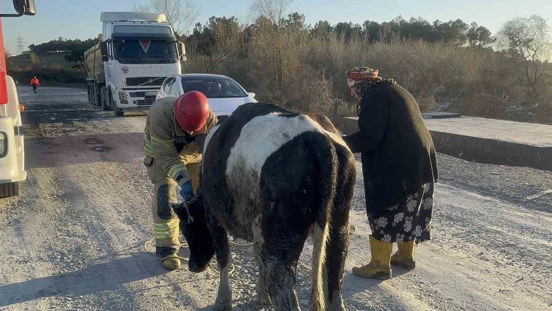 Arnavutköy’de hayvanlarını otlaması için çayırlık araziye çıkartan yaşlı kadının bir ineği sulama kanalına düştü. İneği düştüğü yerden itfaiye ekipleri çıkarırken, yaşlı kadın saatlerce hayvanının başından ayrılmadı.