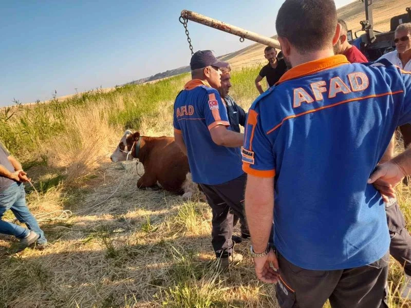 Adıyaman’da, sulama kanalına düşerek mahsur kalan inek AFAD ekiplerince kurtarıldı.