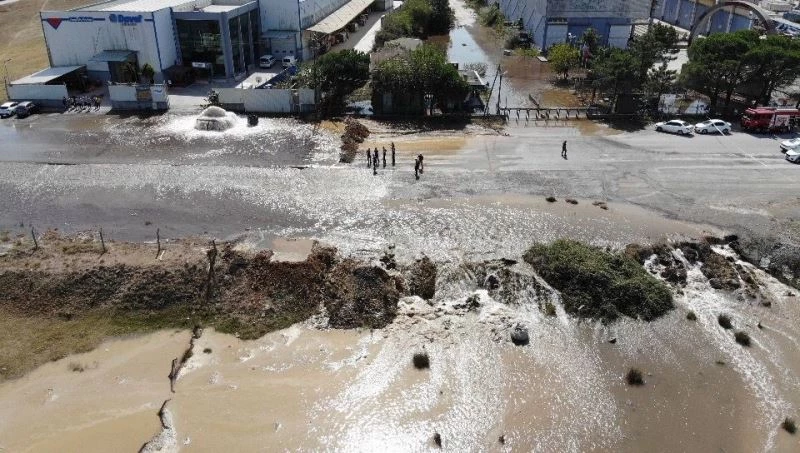 Öte yandan su borusundan suyun fışkırmasıyla göle dönen cadde drone ile havadan görüntülendi.
