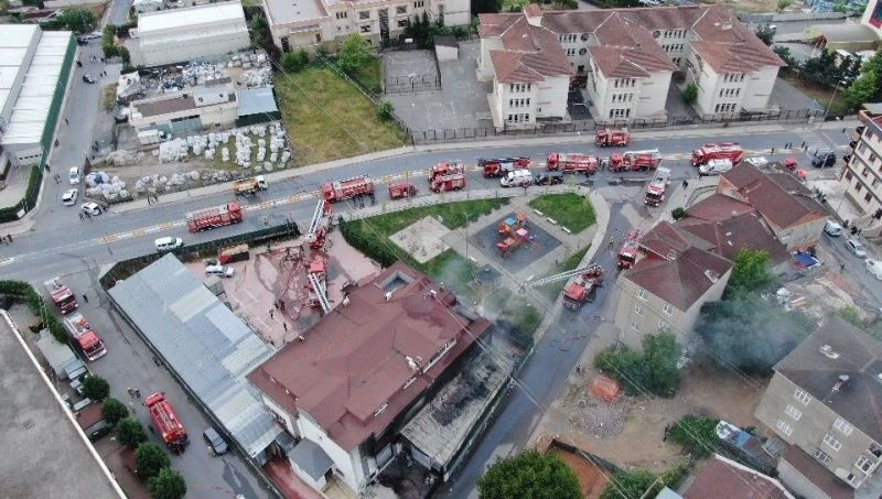 Sultanbeyli’de bir mobilya fabrikasında çıkan yangın itfaiye ekiplerinin müdahalesiyle kontrol altına alınırken, fabrikanın son hali havadan görüntülendi.