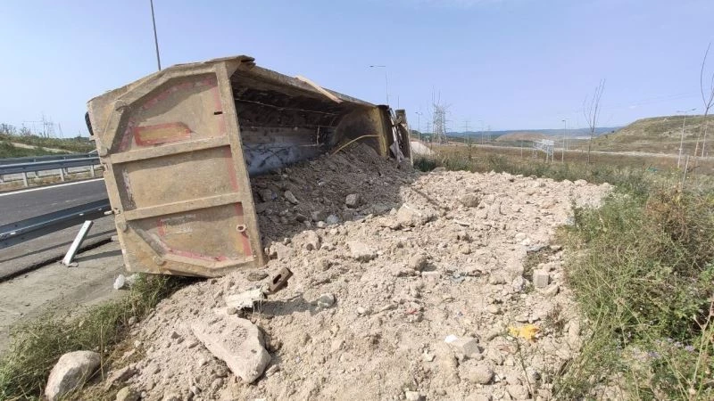 İstanbul Sultangazi’de hafriyat yüklü tır, bariyerlere çarpıp yol kenarına devrildi. Tır sürücüsü kazayı hafif yaralı bir şekilde atlattı.