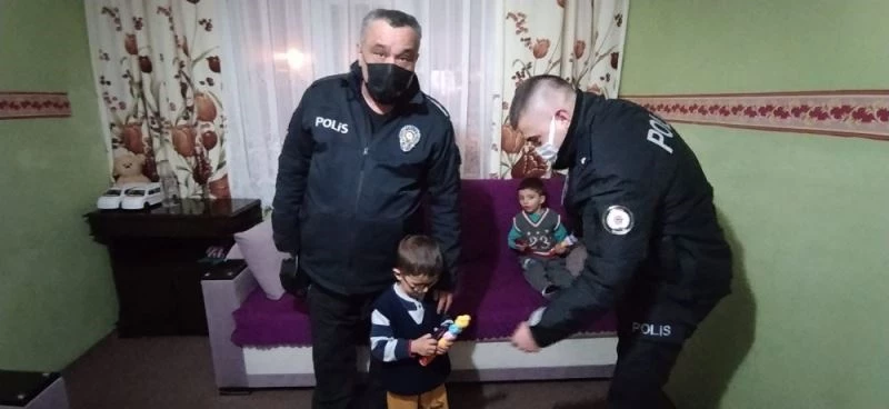 Çorum’un Sungurlu ilçesinde polisler pandemi nedeniyle evlerinden çıkamayan çocuklara hediyeler götürdü.