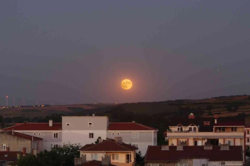 Tekirdağ semalarında izleyenlere muhteşem bir görsel şölen sunan dolunay, tepelerin arkasından doğarak geceyi gündüze çevirdi. 2022 yılının en büyük dolunayı olan Süper Ay, Türkiye saati ile 21.38’de görülmeye başladı. Süper Ay olayı astronomiye ilgi duyan kişiler tarafından heyecanla gözlemlendi.