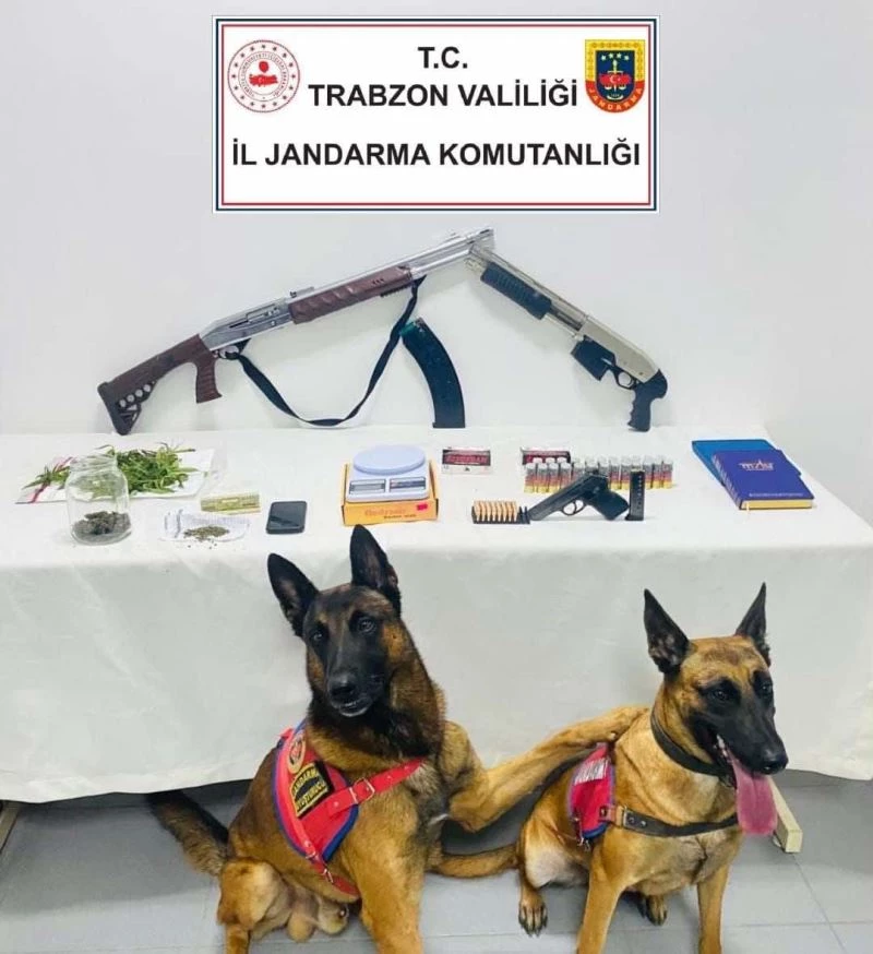 Alınan bilgiye göre, İl Jandarma Komutanlığı Kaçakçılıkla Mücadele Timlerinin yapmış olduğu fiziki takip ve saha araştırmaları sonucu Trabzon’un Sürmene ilçesi Fındıcak Mahallesinde E. K. (34) isimli şahısın evinde uyuşturucu madde ve silah bulunduğu ve bu malzemeleri satmaya çalıştığı tespit edildi. Adli makamlardan alınan arama kararına istinaden eve Jandarma narkotik madde tespit köpekleri Yatkın ve Duman’ın da katıldığı bir operasyon düzenlendi. Evde yapılan aramada 150 gram Kubar Esrar, 1 adet tabanca, 2 tüfek ile bunlara ait fişek ve mermiler ele geçirildi. Şüpheli E.K. gözaltına alınırken, hassas burunlu köpekler operasyonlar sonrası ele geçirilen uyuşturucu ve malzemelerin önünde birlikte “Operasyon tamam” pozu verdi.