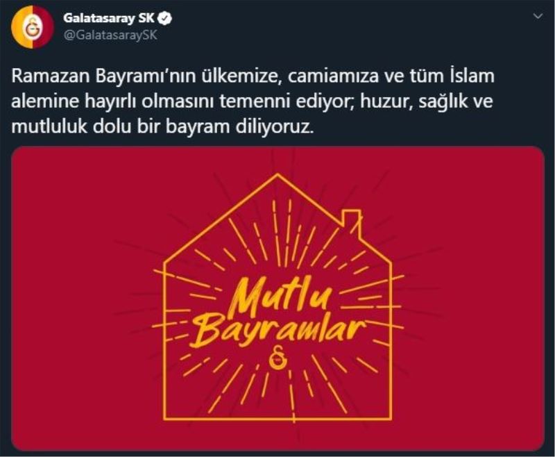 Galatasaray: "Ramazan Bayramı’nın ülkemize, camiamıza ve tüm İslam alemine hayırlı olmasını temenni ediyor; huzur, sağlık ve mutluluk dolu bir bayram diliyoruz."