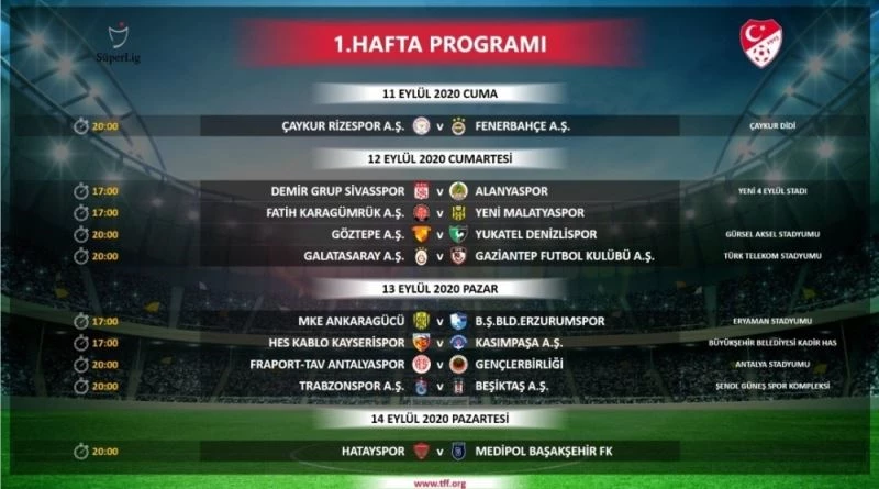 Türkiye Futbol Federasyonu, 11 Eylül’de başlayacak olan Süper Lig’de ilk 4 haftanın programını açıkladı. Sezon Çaykur Rizespor-Fenerbahçe maçıyla başlayacak. 3. haftadaki Galatasaray-Fenerbahçe derbisi, 27 Eylül Pazar saat 19.00’de oynanacak.