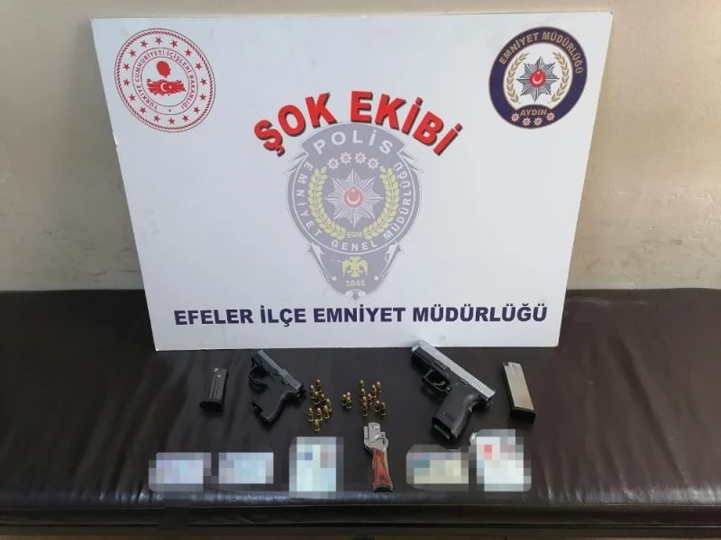 Olay, Orta Mahalle 205 sokak üzerinde saat 15.00 sıralarında meydana geldi. Edinilen bilgiye göre, Efeler İlçe Emniyet Müdürlüğü Devriye Ekipler Amirliği’ne bağlı Şok Ekibi durumundan şüphelendikleri bir otomobile ’dur’ ihtarında bulundu. Polis ekiplerinin ’dur’ ihtarına uymayarak kaçan otomobil yaşanan kovalamaca sonucunda 205 ile 202 sokak kesişiminde durduruldu. Araç içerisindeki E.K., E.H.G., D.C.K. E.Y., A.Y.G. isimli şahısların üstlerinde ve otomobil içerisinde arama yapıldı. Yapılan aramalarda, E.H.G.’nin üzerinde ruhsatsız tabanca ve tabancaya ait 7 fişek, otomobil içerisinde 6136 sayılı kanun kapsamında yasaklanan bıçak ile bir adet ruhsatsız tabanca ve bu tabancaya ait 14 adet fişek ele geçirildi. Şahıslar gözaltına alınarak gerekli işlemler için Efeler Polis Merkezi Amirliği’ne götürüldü.