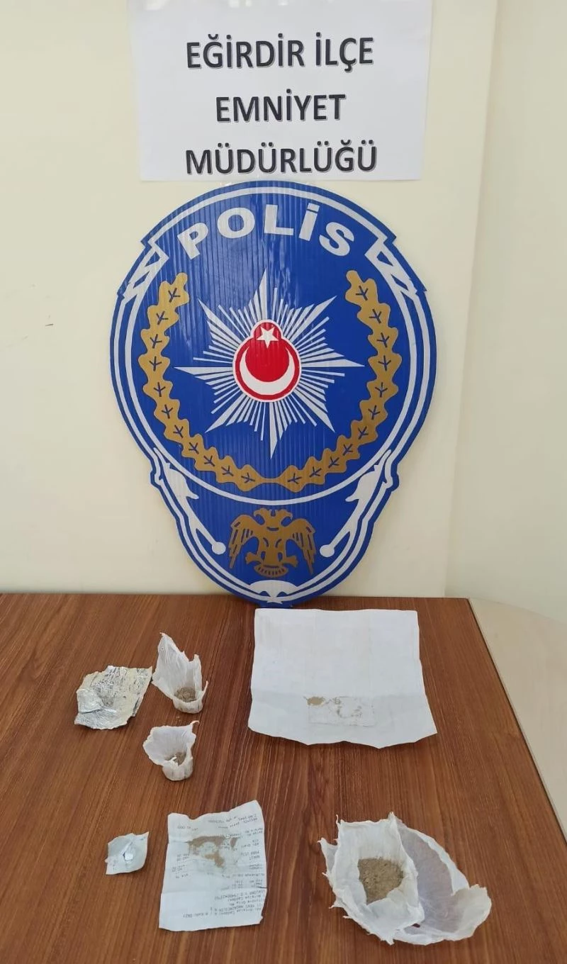 Isparta Emniyet Müdürlüğü Narkotik Şube ve Eğirdir İlçe Emniyet Müdürlüğü ekipleri ile birlikte yapılan çalışmada durumundan şüphelenilen 03 plakalı araç Eğirdir otogar önündeki uygulamada durdurulup detaylı arama yapıldı. Aramada 15 gram eroin olduğu değerlendirilen uyuşturucu madde ve bir adet çeyrek uyuşturucu hap ele geçirildi.
