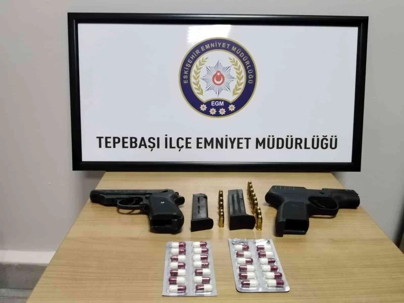 Tepebaşı İlçe Emniyet Müdürlüğünce ilçe genelinde farklı saatler ve mahallelerde halkın huzur ve güvenliğini sağlamak amacıyla asayiş uygulamaları yapılıyor. Bu kapsamda önceki gece saat 21.40 sıralarında Tepebaşı İlçe Emniyet Müdürlüğüne bağlı bekçi yaya devriyeler tarafından Gazi Yakup Satar Caddesi üzerinde durumundan şüphelenilen bir araç durduruldu. Yapılan incelemede içerisinde O.Ö., M.Ş., A.A. ve İ.S. isimli şahısların olduğu aracın gözle görülür kısmında 26 adet sentetik ecza hap, 2 adet tabanca ve 13 adet fişek ele geçirildi. Konu hakkında tahkikat başlatıldı.