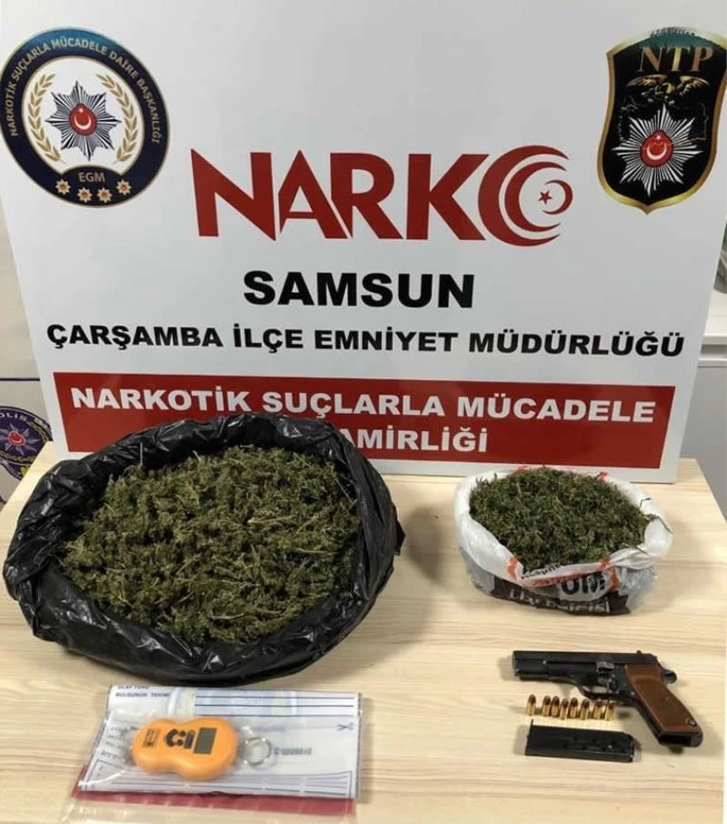 Çarşamba İlçe Emniyet Müdürlüğü Narkotik Suçlarla Mücadele Grup Amirliği ekiplerince alınan istihbarı bilgiler neticesinde Samsun’un Ayvacık ilçesinde durdurulan şüpheli şahsın aracında ve üst aramasında yapılan kontrollerde 1 kilo 16 gram esrar maddesi, 1 adet ruhsatsız tabanca, 8 adet tabanca fişeği, 1 adet hassas terazi ele geçirildi. Soruşturma kapsamında 1 şahıs yakalanarak ‘uyuşturucu madde imal ve ticareti yapmak’ suçundan gözaltına alındı.