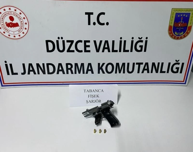DÜZCE – Düzce’nin Beyköy Beldesinde Jandarma ekipleri tarafından yapılan denetimde şüpheli hareketler sergileyen şahsın üzerinden kurusıkıdan geçme ruhsatsız tabanca ele geçirildi.