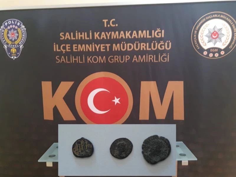Manisa’nın Salihli ilçesinde düzenlenen tarihi eser operasyonunda Roma dönemine ait 3 adet sikke ele geçirildi.